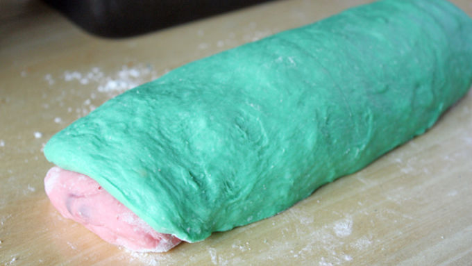Step5Remove risen green dough from bowl and flatten into a rectangle about 3 by 8 inches. Carefully dome green dough over red dough, stretching as needed until long edges of green dough completely cover red dough.