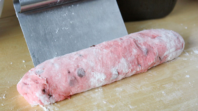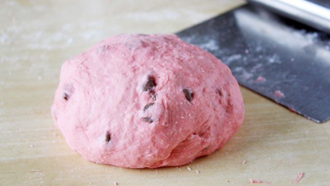 Step2Divide dough into two pieces, one piece twice as large as the other. Into the larger piece of dough, stir chocolate chips and enough red coloring to dye dough to a deep pink color, adding up to 1/4 cup remaining flour as needed until dough is smooth and elastic and pulls away from sides of bowl, about 5 minutes. Remove red dough from bowl and place in another bowl. Cover and let rise until doubled, about 1 1/2 to 2 hours.