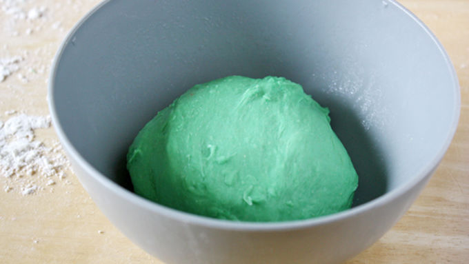 Step3In a clean bowl, stir enough green food coloring to completely dye dough into smaller piece of dough, adding up to 1/4 cup remaining flour as needed until dough is smooth and elastic and pulls away from sides of bowl, about 5 minutes. Remove dough from bowl and place in another bowl. Cover and let rise until doubled, about 1 1/2 to 2 hours.