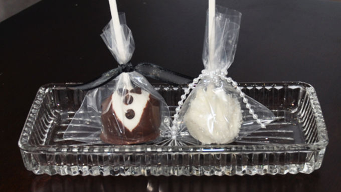 Step10For the grooms: Melt 12 oz. of semi-sweet chocolate chips in the microwave or double boiler. Dip each side of the cake pop into the chocolate to form the tux coat. Decorate with piped chocolate or mini-chocolate chips for the bow tie and buttons.