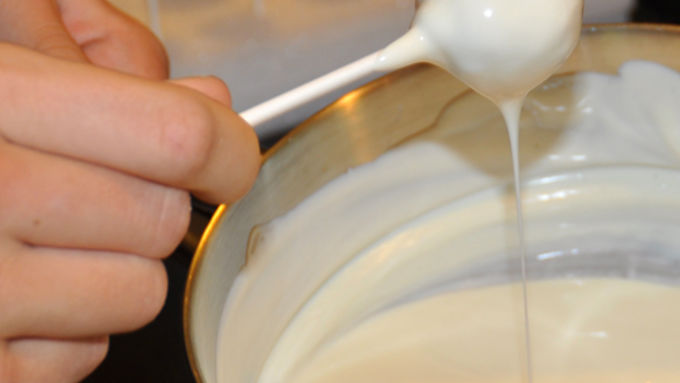 Step7Melt 16 oz. of white chocolate candy in the top of a double boiler (or microwave). Keep the candy warm and fluid while you work. Dip about 1/2 inch of the end of a stick into the melted candy, then push it about 1/3 of the way into a cake ball. Set the ball upside down on the wax-paper-covered tray. Repeat until all cake balls are done. Allow the sticks to set up so they are secure in the cake balls. (Set tray in the fridge to chill if necessary.)