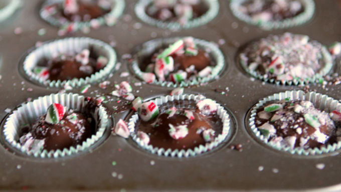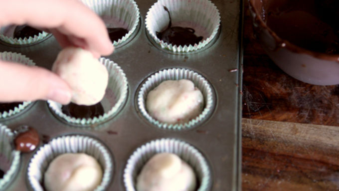 Step6Place 24 small candy wrappers into a mini muffin tin. Spoon a small amount of melted dark chocolate into the bottom of each candy wrapper. Place a white chocolate truffle ball on top of the chocolate, then drizzle just enough chocolate over the white chocolate truffle to cover it completely.
