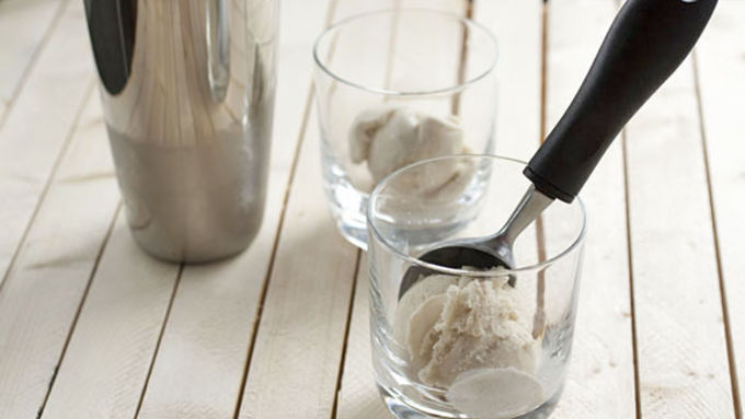 Step2Add a big scoop, about 1/2 cup, of vanilla ice cream to a small cocktail glass.