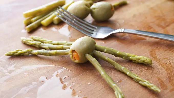 Step3To make fun olive spiders, poke a few holes in each side of the olives and stick in some pickled asparagus for legs.
