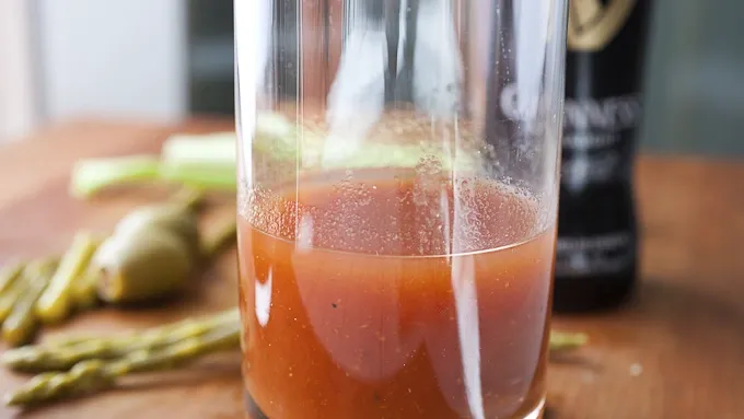 - I’m about to rock your brunch world. The key to making your best spicy bloody Mary even better is to top it off with a creamy Guinness™. It levels off some of the acidity and makes it really smooth. I’m getting ahead of myself though. Since it’s October, it felt right to make some olive spiders! And yes, I know spiders should have 8 legs, but I couldn’t fit 8 spicy asparagus spears in one olive. You don’t need to overthink the Bloody Mary part of this. Just buy a good spicy mix and mix it with vodka. Personally, I like a 2-to-1 ratio of mix to vodka, but use your best judgment! Once you have your base ready, transfer it to a glass with a lot of ice. Top it off with that beer! Personally, I like to serve each glass with its own beer so you can keep topping it off. That’s all there is too it! Have a spooky Witch’s Blood Cocktail this October!