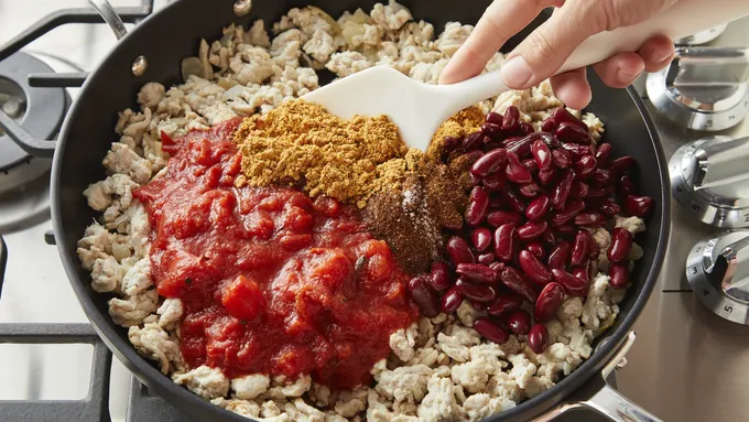Step2Stir in taco seasoning mix, chili powder, salt, beans and tomatoes; heat to simmering. Cook 3 to 4 minutes, stirring occasionally, until completely heated through and bubbling on edges.